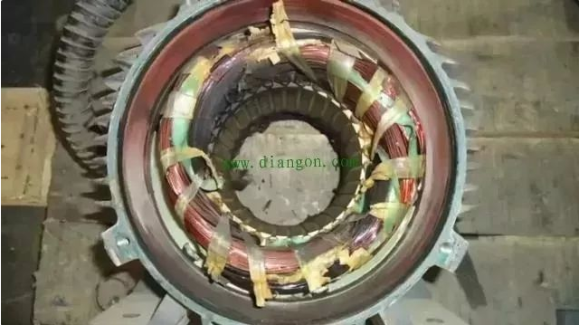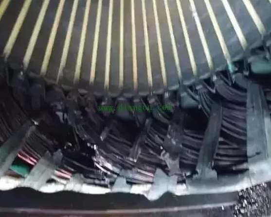 繞組全部變黑色,端部扎帶變色并且變脆甚至斷裂。