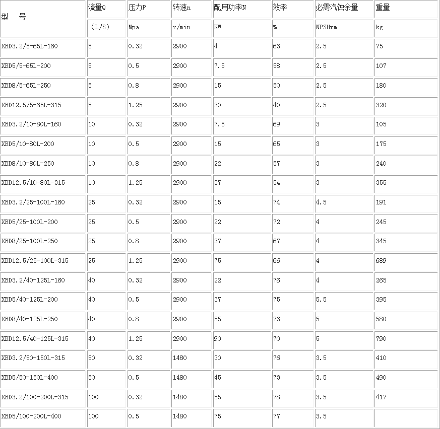 XBD立式消防泵性能參數表